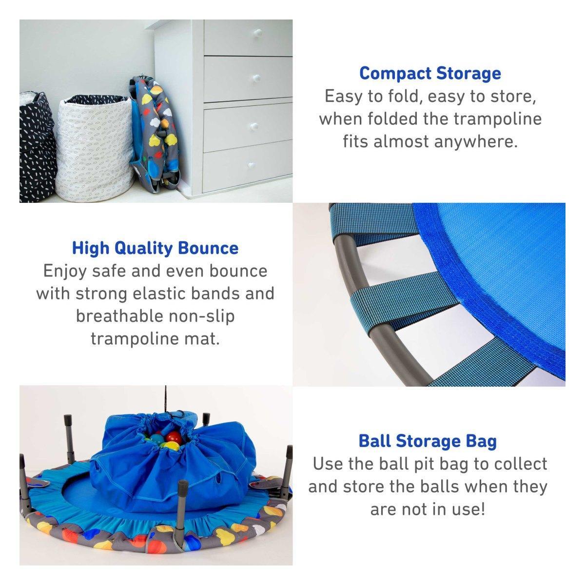 Dječji sklopivi trampolin koji se lako može sklopiti, štedi prostor i omogućava sigurnu igru, dok ga ponovno ne sastavite na upotrebu.